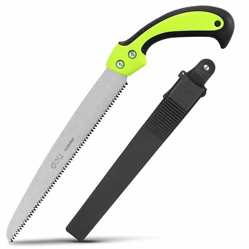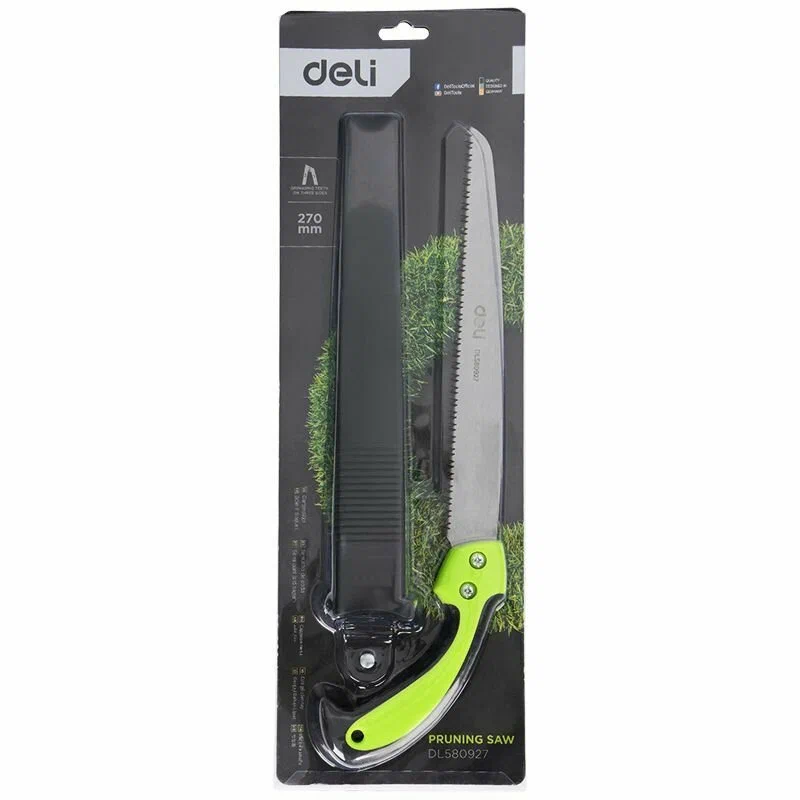 Садовая пила с ножнами Deli DL580927 270мм (сталь 65Mn, шаг зубьев 7TPI, обрезиненная ручка, шлифовка зубов с 3-х сторон, двухрядная кромка)