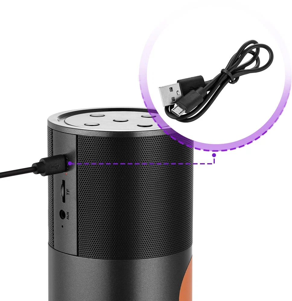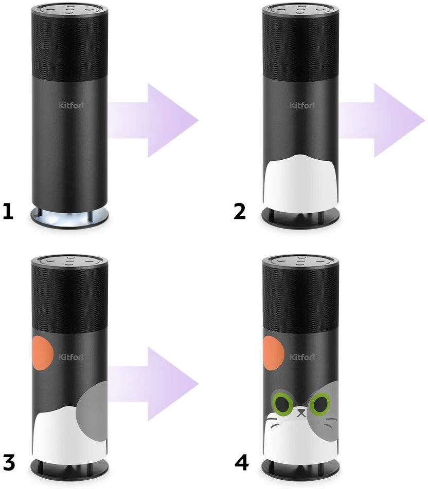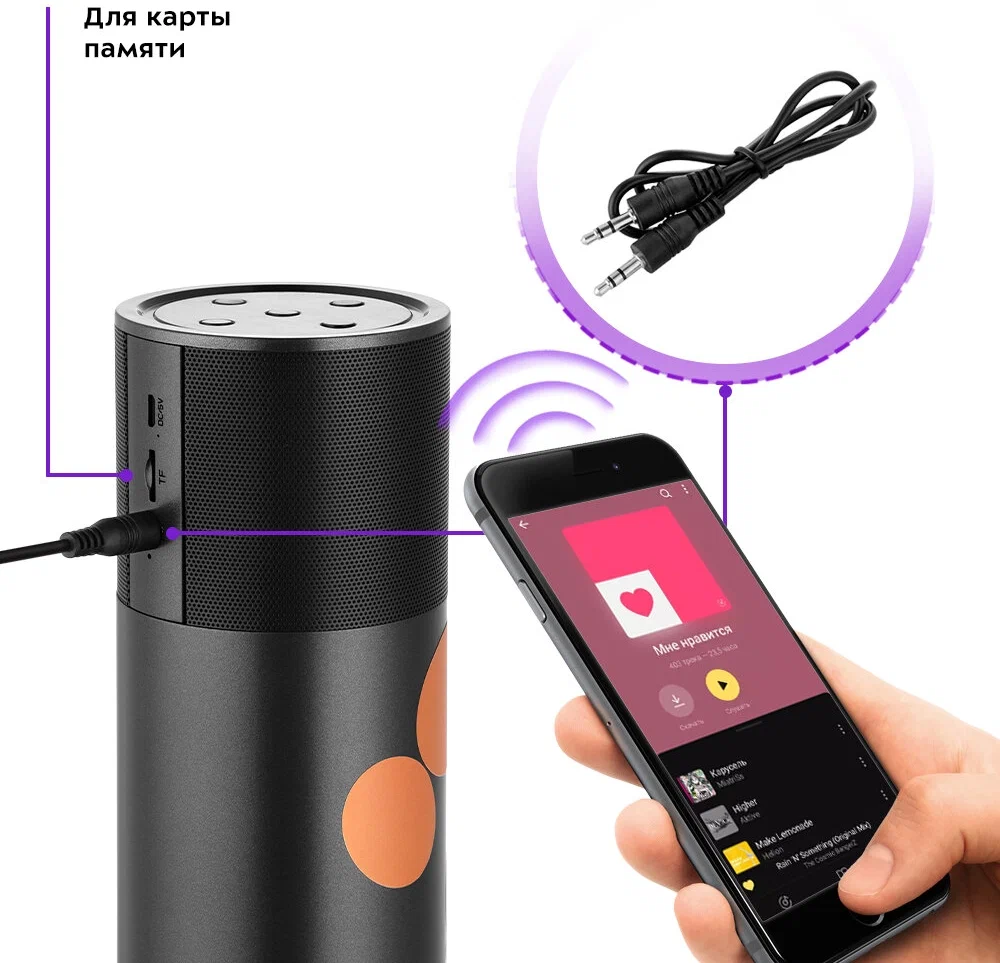 Частотный диапазон колонки составляет 100–18000 Гц, что обеспечивает высокое качество звука. Колонка подключается к мобильному устройству через шнур AUX (входит в комплект) или посредством Bluetooth. Есть возможность подключения карты памяти (TF или MicroSD). Либо вы можете слушать любимую радиостанцию в режиме "Радио". Встроенный в колонку микрофон позволяет не только воспроизвести звонок на громкую связь, но и ответить на него. Он располагается рядом с разъёмом для подключения шнура AUX. На верхней части колонки расположена панель управления, с помощью которой вы можете переключать песни, режимы воспроизведения (Bluetooth, карта памяти, AUX, радио), регулировать громкость и управлять подсветкой. В нижней части колонки находится приятная неяркая подсветка, которая плавно мигает. Подсветку можно в любой момент отключить. В комплекте с колонкой КТ-3366 идёт набор наклеек для создания образа милого котика. Каждая деталь пронумерована для соблюдения последовательности нанесения. В любой момент их можно отклеить - наклейки не оставляют следов на поверхности. На задней стороне корпуса расположены разъёмы для зарядки (подключения шнура Micro-USB). Для зарядки устройства используйте блок питания с USB-разъёмом и параметрами: =5 В, не менее 0,5 A. Также можно заряжать устройство через компьютер или пауэрбанк. Устройство компактное и лёгкое: его удобно брать с собой. Просто зарядите колонку и возьмите с собой в путешествие, на прогулку или пикник. Если аудио не воспроизводилось в течение 5 мин, для экономии заряда колонка автоматически выключится.