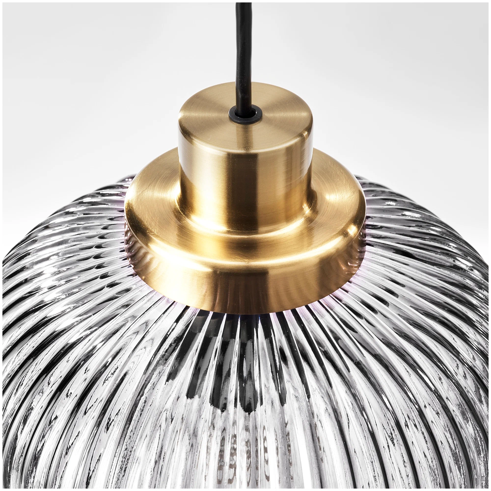 Светильники СОЛКЛИНТ, похожие на нежные украшения из золотистой латуни со сверкающим абажуром из серого стекла, дают мягкий атмосферный свет и создают на стенах и потолке красивую игру света и тени, где бы вы их ни включили.