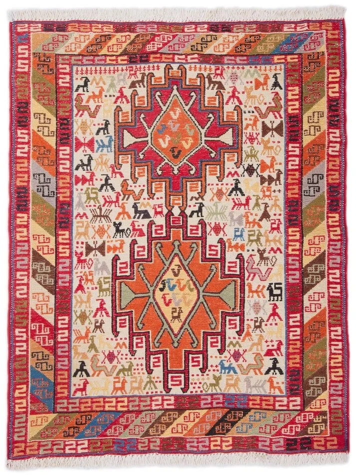 Каждый ковер ручной работы – настоящее произведение искусства. Его украшает традиционный орнамент из ромбов, квадратов, полосок и звезд. В колористическом решении используются синий, желтый, красный, зеленый и бежевый цвета.