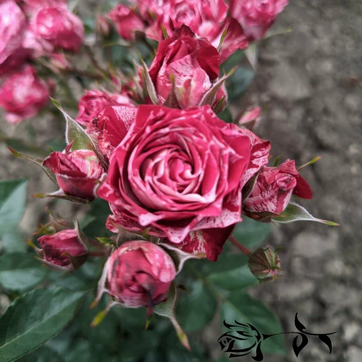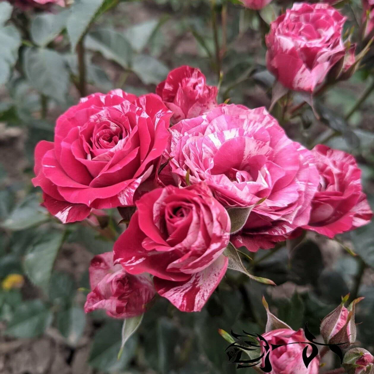 Небольшой куст с небольшими, но очень красивыми, цветками красного цвета с бело-малиновой полоской.