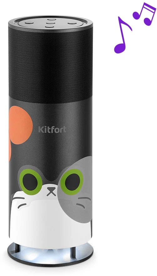Частотный диапазон колонки составляет 100–18000 Гц, что обеспечивает высокое качество звука. Колонка подключается к мобильному устройству через шнур AUX (входит в комплект) или посредством Bluetooth. Есть возможность подключения карты памяти (TF или MicroSD). Либо вы можете слушать любимую радиостанцию в режиме "Радио". Встроенный в колонку микрофон позволяет не только воспроизвести звонок на громкую связь, но и ответить на него. Он располагается рядом с разъёмом для подключения шнура AUX. На верхней части колонки расположена панель управления, с помощью которой вы можете переключать песни, режимы воспроизведения (Bluetooth, карта памяти, AUX, радио), регулировать громкость и управлять подсветкой. В нижней части колонки находится приятная неяркая подсветка, которая плавно мигает. Подсветку можно в любой момент отключить. В комплекте с колонкой КТ-3366 идёт набор наклеек для создания образа милого котика. Каждая деталь пронумерована для соблюдения последовательности нанесения. В любой момент их можно отклеить - наклейки не оставляют следов на поверхности. На задней стороне корпуса расположены разъёмы для зарядки (подключения шнура Micro-USB). Для зарядки устройства используйте блок питания с USB-разъёмом и параметрами: =5 В, не менее 0,5 A. Также можно заряжать устройство через компьютер или пауэрбанк. Устройство компактное и лёгкое: его удобно брать с собой. Просто зарядите колонку и возьмите с собой в путешествие, на прогулку или пикник. Если аудио не воспроизводилось в течение 5 мин, для экономии заряда колонка автоматически выключится.