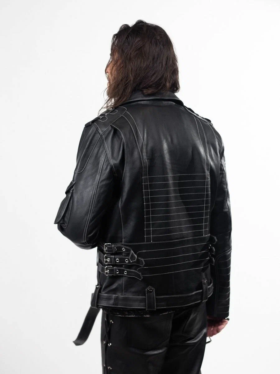 Сшита косуха из натуральной кожи быка и дополнительно прошита белой нитью по всем значимым швам – брутальности ей не занимать.