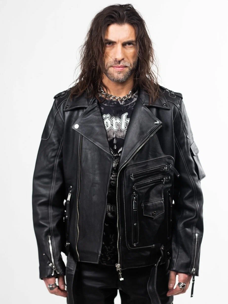 Погоны на застежках-кнопках, лацканы с отворотом, тройные регулировочные ремешки по бокам, пять карманов на молнии и еще один на кнопке – у этой косухи есть все, что нужно.