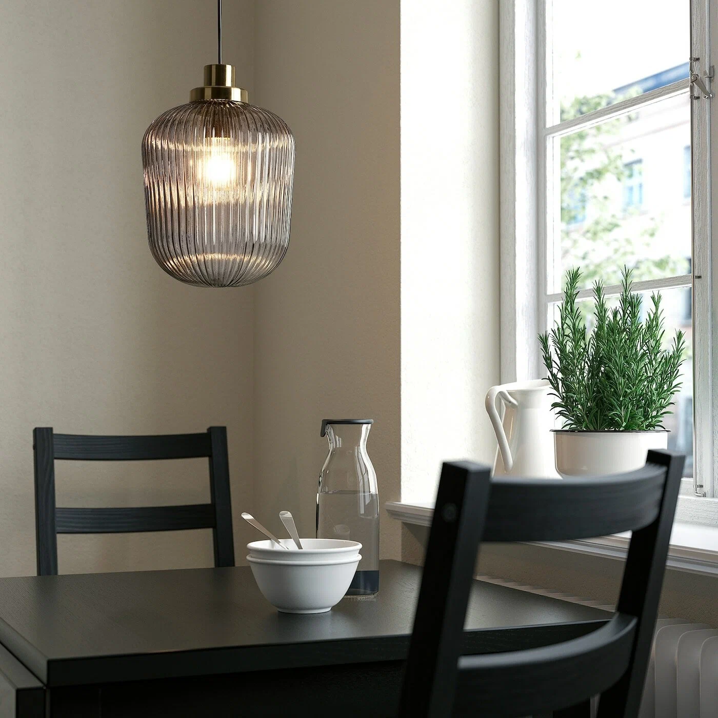 Светильники СОЛКЛИНТ, похожие на нежные украшения из золотистой латуни со сверкающим абажуром из серого стекла, дают мягкий атмосферный свет и создают на стенах и потолке красивую игру света и тени, где бы вы их ни включили.