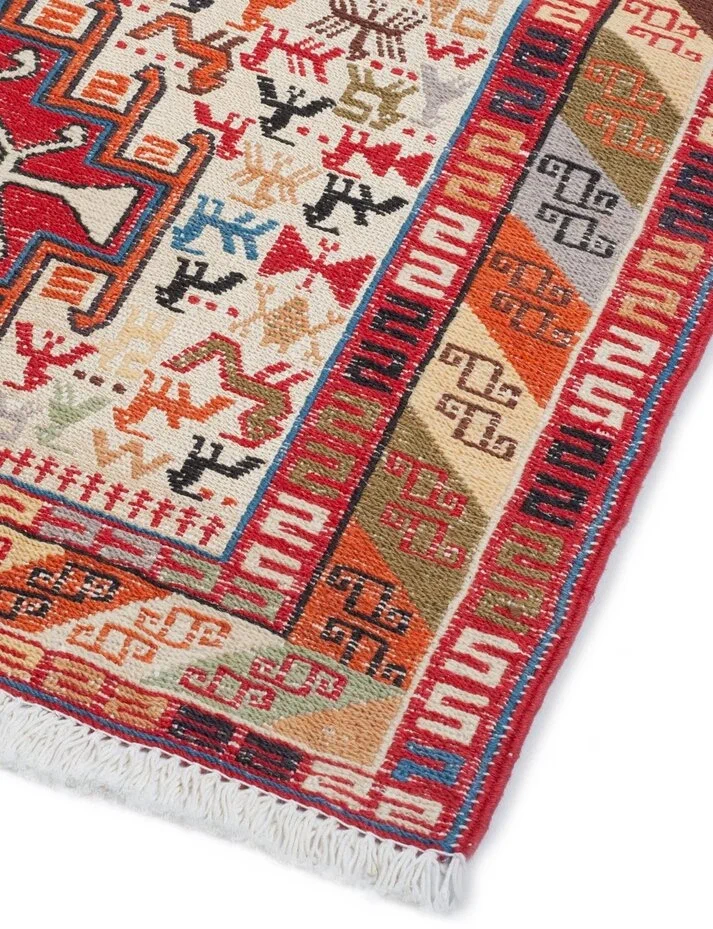 Каждый ковер ручной работы – настоящее произведение искусства. Его украшает традиционный орнамент из ромбов, квадратов, полосок и звезд. В колористическом решении используются синий, желтый, красный, зеленый и бежевый цвета.